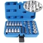 Ein 34 teiliger Steckschlüssel-Satz mit Torx hergestellt aus hochwertigem Chrom Vanadium Stahl. Die Steckschlüssel sind matt und gerändelt und eignen sich für den Dauereinsatz in Werkstätten.