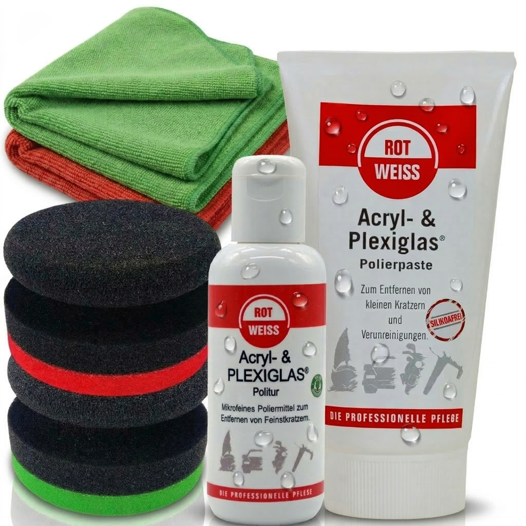 Rotweiss Acryl & Plexiglas Polierpaste + Politur + 2 Stück Handpolierschwamm + 2 Stück Microfasertuch