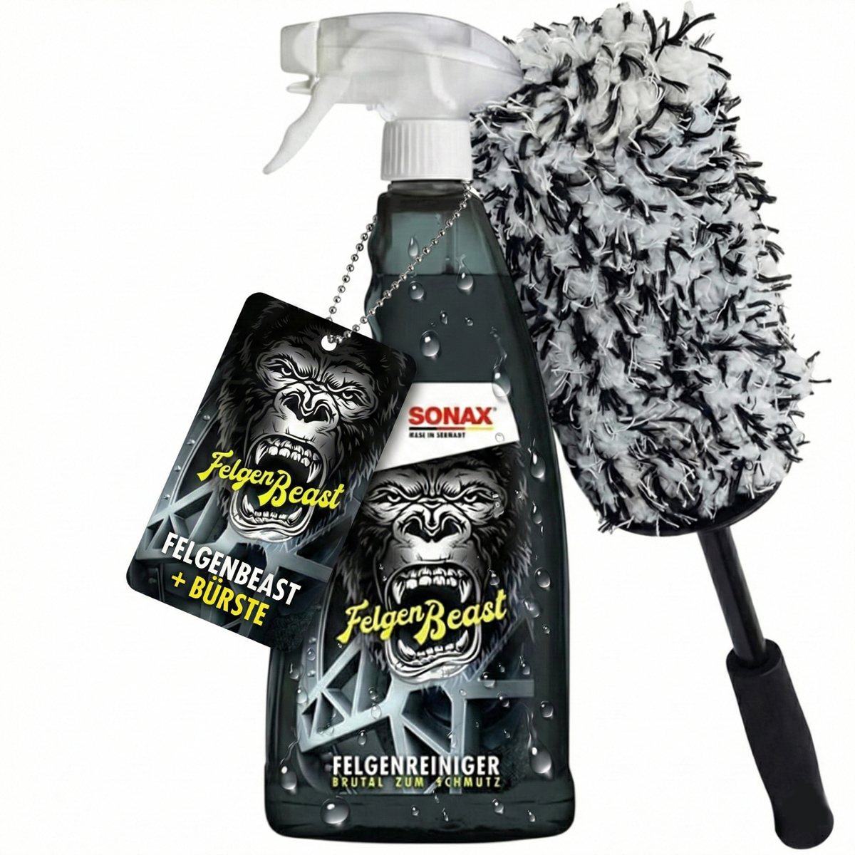 Der SONAX FelgenBeast Felgenreiniger mit der passenden Microfaser Felgenbürste im Vorteils-Set.Lieferumfang: