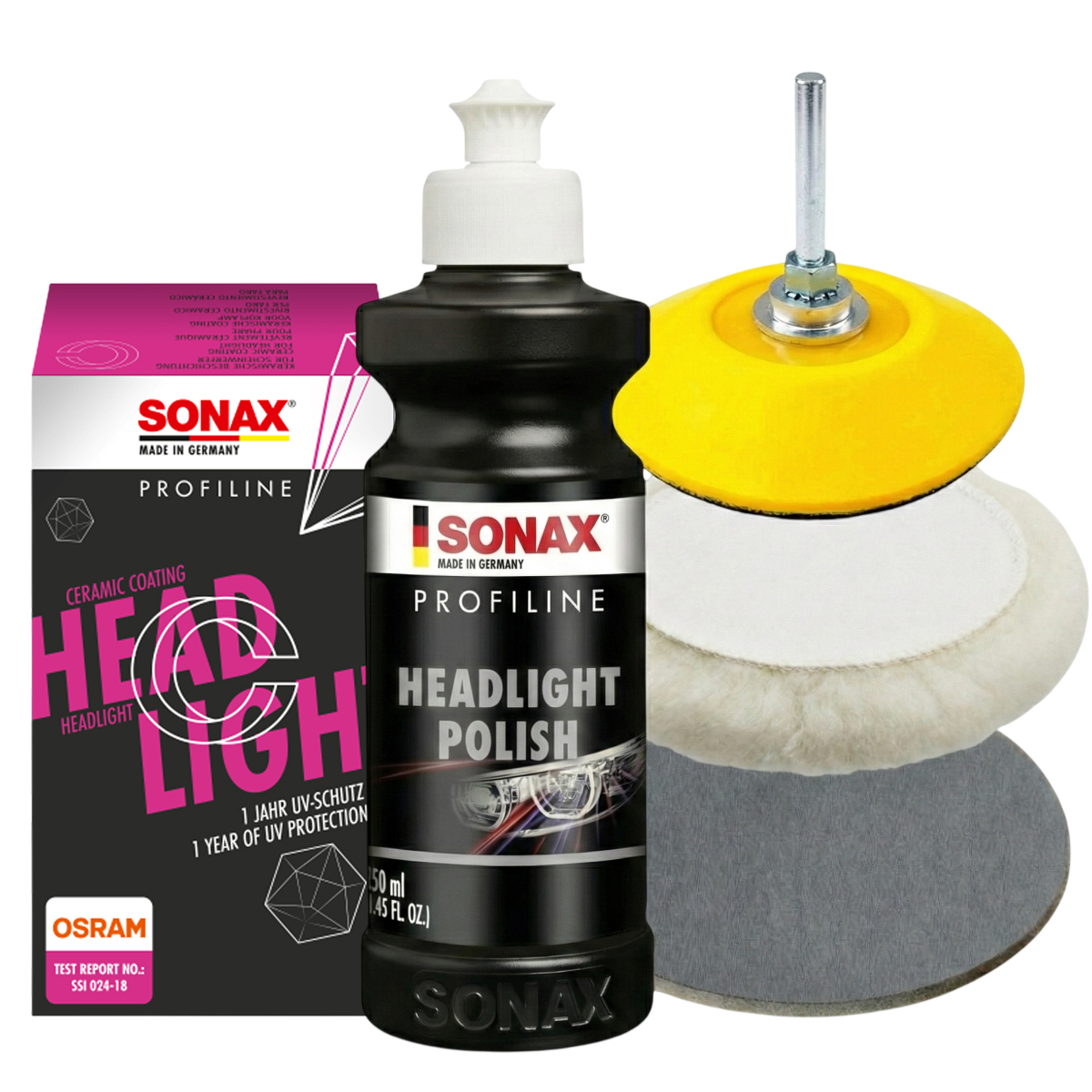 SONAX 250ml Headlight Polish + SONAX CC Headlight + Klett-Teller + Mattierungsscheibe + Lammfell